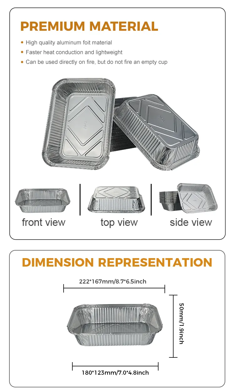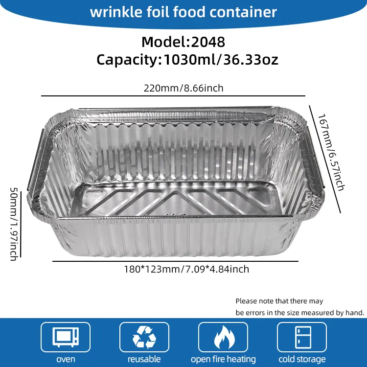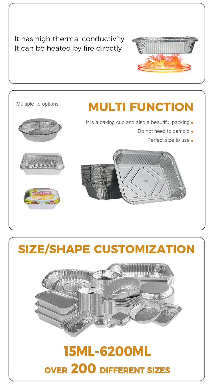Ang disposable barbecue baking lunch box ng Yunchu Aluminum Foil Factory na silver aluminum foil container ay gawa sa mataas na kadalisayan na food-grade aluminum foil. Ito ay hindi nakakalason at walang lasa, lumalaban sa mataas na temperatura at mababang temperatura. Ang punto ng pagkatunaw ay kasing taas ng 250°C. Maaari itong direktang kontak sa pagkain. Hindi ito naglalabas ng mga nakakapinsalang sangkap kapag pinainit sa mataas na temperatura. Maaari din itong mapanatili ang matatag na hugis kapag pinalamig at nagyelo. Ito ay isang beses na disenyo at maaaring itapon pagkatapos gamitin. Hindi na kailangang gumugol ng oras sa paglilinis ng mga plato at baking pan, ganap na nagde-detox. Nilulutas nito ang nakakapagod na problema ng paglilinis pagkatapos kumain, at angkop lalo na para sa mga eksena tulad ng mga pagtitipon ng maraming tao at paglalakbay sa labas. Ang na-upgrade na thickened aluminum foil material ay may solidong texture at malakas na kapasidad na sumusuporta. Hindi madaling tumulo o mag-deform kapag may hawak na mga pinggan na may mga sopas o mabibigat na sangkap ng barbecue. Ang mga gilid ay makinis at walang burr, kaya mas ligtas itong gamitin. Angkop din ito para sa mga oven, air fryer, steamer at iba pang kagamitan sa kusina, at ang pagluluto at paghahatid ay maaaring gawin sa isang hakbang.