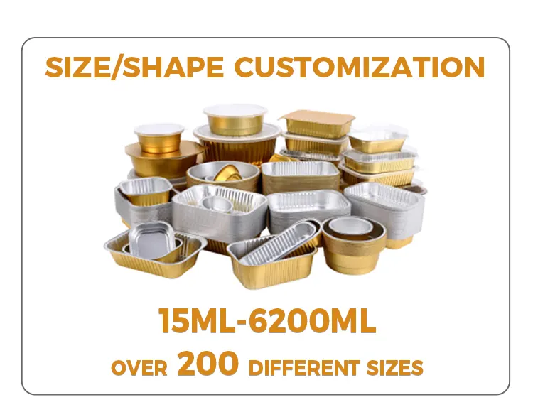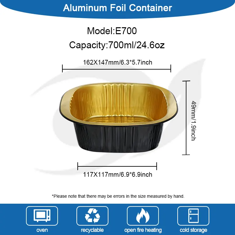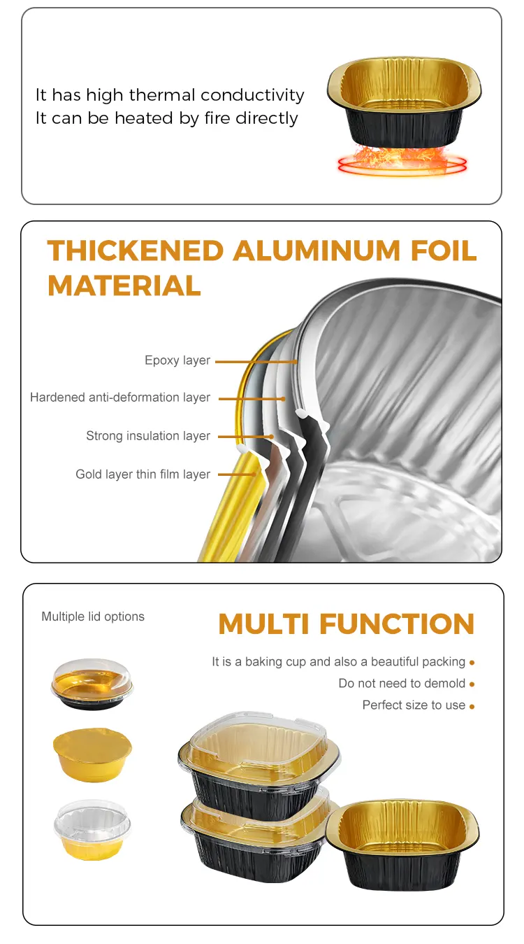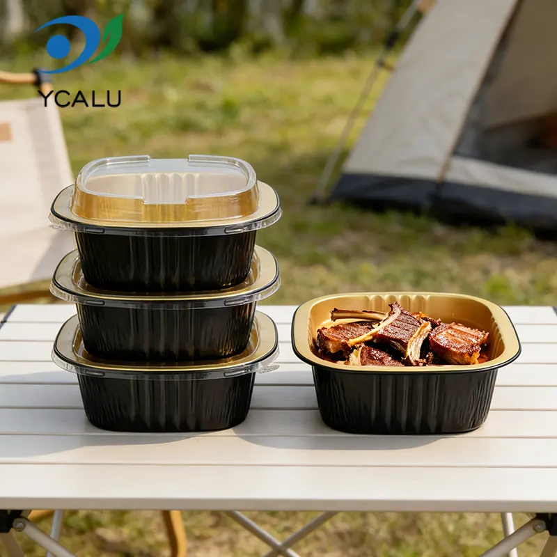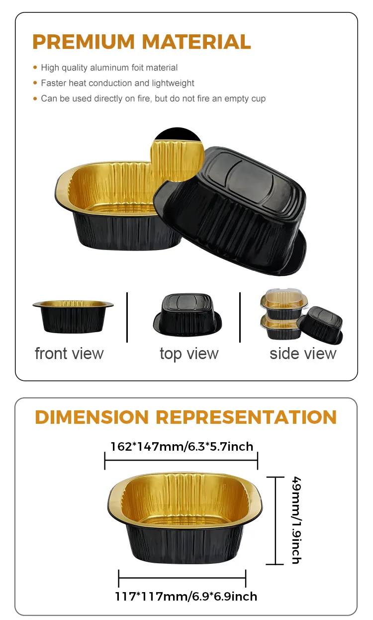 Ang disposable double-ear square box ng Yunchu Aluminum Foil Supplier na black gold light-walled aluminum foil container ay may hugis parisukat na disenyo, full space utilization, bilugan at makinis na sulok, walang matutulis na burr, at mas ligtas gamitin; maalalahanin na disenyo ng double-ear, ergonomic, insulated at anti-scalding, madaling kunin, kahit na naglalaman ito ng mga maiinit na pagkain at sopas, madali itong hawakan upang maiwasan ang mga paso sa kamay at malutas ang hindi maginhawang punto ng sakit ng mga tradisyonal na aluminum foil box. Gawa sa makapal na aluminum foil, mayroon itong solid at matigas na texture, malakas na kapasidad na sumusuporta, at hindi madaling ma-deform o masira. Maaari itong maglaman ng pagkain na may mga sopas at taba nang walang butas na tumutulo o mga problema sa pagtagas sa gilid, at ang tibay nito ay higit na nakahihigit sa mga ordinaryong disposable lunch box.