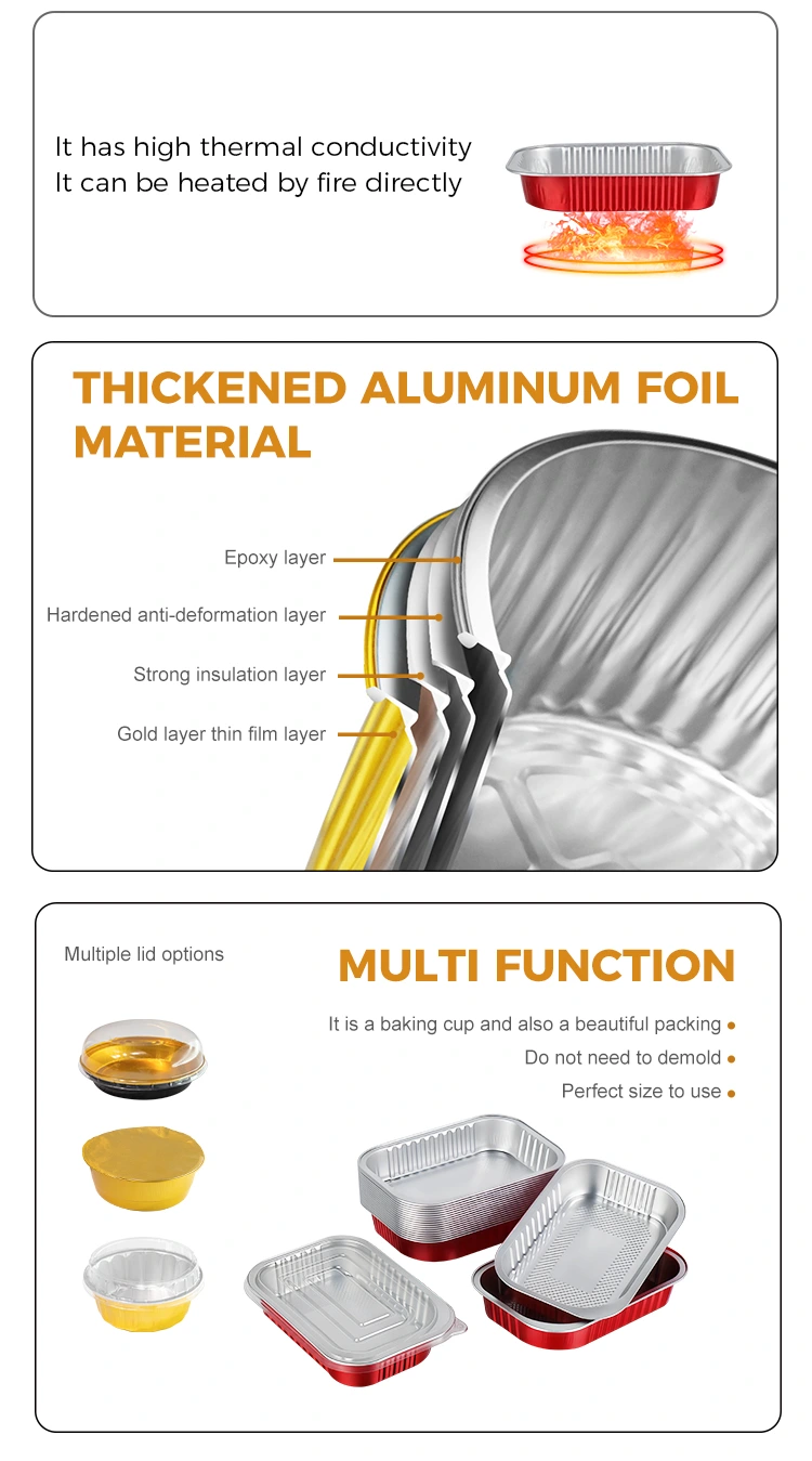 -Ang materyal ng Rectangle Red Aluminum Take Out Container ay maaaring mag-lock sa pagiging bago at pagiging bago ng pagkain. Ang mahusay na pagpapadaloy ng init at mga katangian ng pagkakabukod nito ay nagpapahintulot na ito ay direktang pinainit sa oven, microwave, at palamigin sa refrigerator, na epektibong nakakandado sa orihinal na lasa ng pagkain at nagpapanatili ng perpektong lasa sa loob ng mahabang panahon.