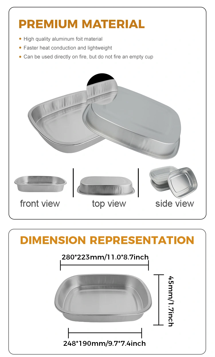 4. Ang Takeaway Square Sliver Aluminum Foil Food Pans ay gumagamit ng simple at maayos na mga linya, na kinumpleto ng modernong silver luster. Mapapahusay nito ang visual appeal ng pagkain at ang pangkalahatang kalidad, na tumutulong na palakasin ang propesyonal at upscale na imahe ng brand.