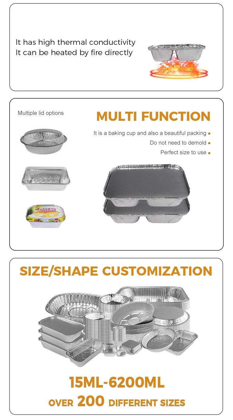 Ang disposable compartment fast food pilak aluminyo foil container na may takip ng papel ay may mahusay na pagpapanatili ng init at maaaring mapabagal ang pagkawala ng init ng pagkain. Sa taglagas at taglamig, mayroon itong mahusay na epekto sa pagpapanatili ng mainit na pagkain, tulad ng sariwang ginawang mainit na nilagang ilagay sa ito, na maaaring mapanatili ang temperatura ng pagkain para sa isang tiyak na tagal ng panahon, upang ang mga mamimili ay masisiyahan sa mainit na pagkain kapag kumakain.