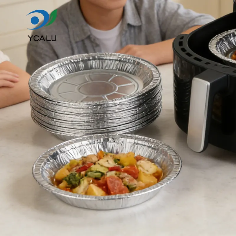 Yunchu Aluminum Foil Disposable Disk Air Fryer Silver Aluminum Foil Container Ang food-grade na may mataas na kadalisayan na aluminum foil ay walang mga dumi at amoy, at sumusunod sa pambansang pamantayan ng materyal sa pakikipag-ugnayan sa pagkain. Maaari itong direktang makipag-ugnayan sa mga hilaw at lutong sangkap - ito man ay adobong barbecue, nakakapreskong inihaw na gulay, o malambot, malagkit at matamis na inihaw na dessert. Walang pagkakataong makalusot ang mga nakakapinsalang sangkap. Ang silver glossy aluminum foil ay may mahusay na thermal conductivity. Ang isang pirasong disenyo ng disc ay akma sa karamihan ng mga laki ng air fryer. Available sa 6-inch, 7-inch, at 8-inch na laki, ito ay angkop para sa maliliit na bahagi at pagbabahagi sa buong pamilya. Hindi na kailangan ng paulit-ulit na pagsasaayos. Madali itong mailagay sa basket ng pagprito, na nagpapahintulot sa mga pakinabang ng materyal na ganap na magamit.