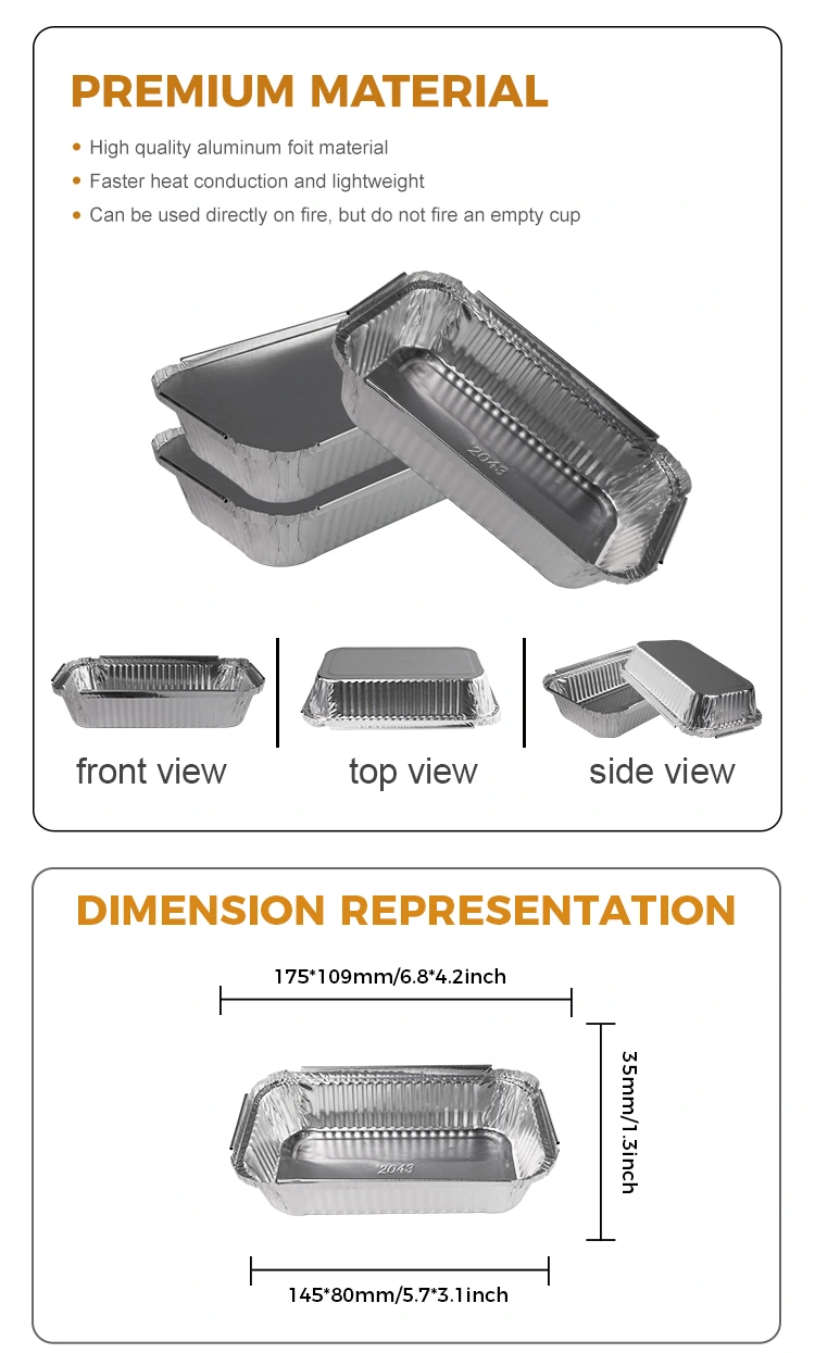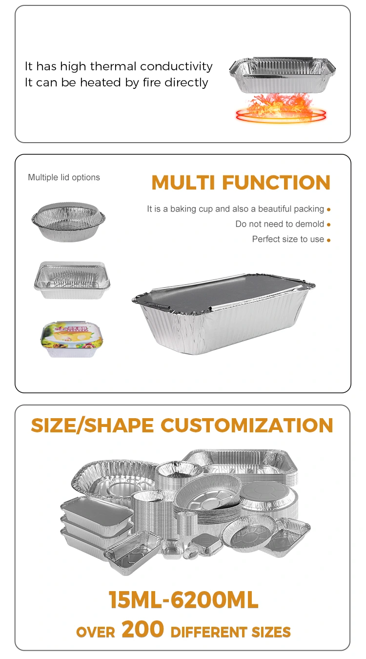 Ang disposable fast food box barbecue pilak na aluminyo na lalagyan ng foil ay gawa sa mataas na kalidad na 8011 na aluminyo na foil na materyal, na may mahusay na epekto sa pangangalaga ng init at maaaring mapanatili ang temperatura ng pagkain, na ginagawang mas masarap at masarap ang pagkain. Bilang karagdagan, ang aming hugis -parihaba na BBQ pilak na aluminyo foil container ay nilagyan din ng isang thermal pagkakabukod function, na maaaring ipares sa aluminyo foil takip o alagang plastik na takip, na kung saan ay maginhawa para sa na -customize na logo at karagdagang pagpapahusay ng imahe ng tatak.