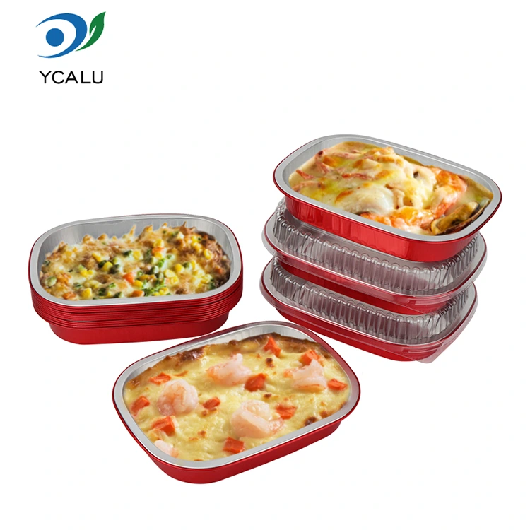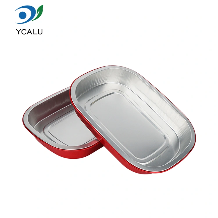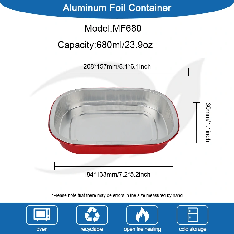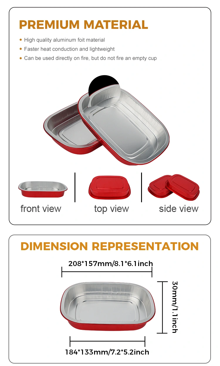 Ang Yunchu ay isang propesyonal na tagagawa at supplier ng Aluminum Foil Containers sa China. Ang Disposable red lunch box square Aluminum Foil Container na ibinibigay namin para sa iyo ay may diameter na 208*157 millimeters (8.1*6.1 inches). Ang mas mababang diameter ay 184*133 (7.2*5.2 pulgada), ang taas ay 30 (1.1 pulgada), at ang kapasidad ay humigit-kumulang 680 mililitro (23.9OZ). Gumagamit ito ng food-grade 8011 food-grade na aluminum foil na pinalapot na base na materyal, na isinasaalang-alang ang parehong tibay at kapasidad na nagdadala ng pagkarga, ay hindi madaling ma-deform o tumagas, at maaaring direktang suportahan ang pagkain. Ito ay katugma sa isang ultra-wide na hanay ng temperatura na -20 ℃ hanggang 220 ℃. Hindi kailangan ng demolding. Maaari itong direktang ilagay sa oven, air fryer o steamer para magamit, at maaari ding i-refrigerate para sa pangangalaga. Nag-aalok ito ng one-stop na maginhawang karanasan ng "baking - storage - consumption - disposal". Ang pangunahing bentahe ng aluminum foil ay ang mataas na thermal conductivity nito. Ang ginintuang patong ay nakakatulong sa pagkuha ng init, na tinitiyak na ang pagkain ay pinainit nang pantay-pantay at mabilis.