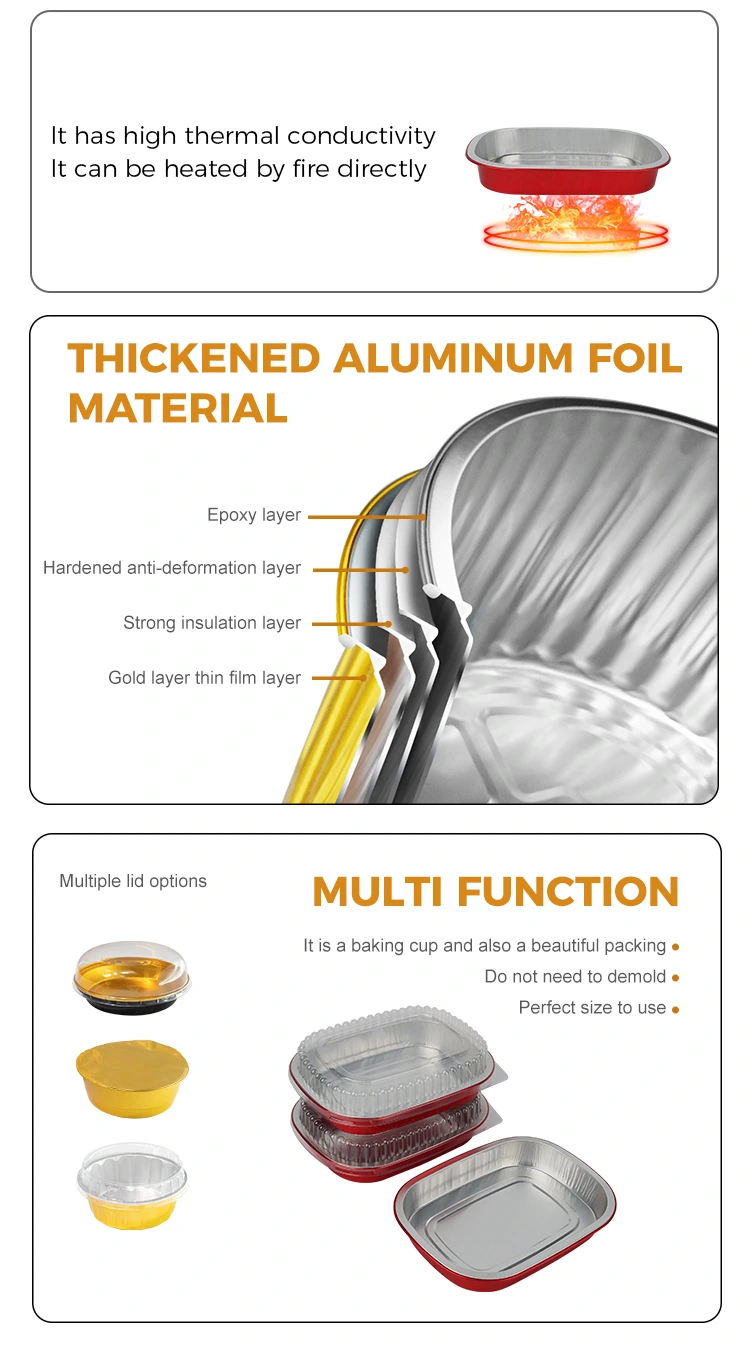 Baguhin ka mang panadero na nagbe-bake ng cookies at egg tart, o isang advanced na manlalaro na nagbe-bake ng pasta at buong isda, ang mga disposable red lunch box square na Aluminum Foil Container ay maaaring ganap na maiangkop. Hindi na kailangang magsipilyo ng langis nang maaga. Ang mga sangkap ay maaaring direktang ilagay sa pagluluto sa hurno. Pagkatapos lumabas sa oven, maaari silang direktang ihain sa plato, na inaalis ang problema sa demolding at paglilinis ng baking tray. Ang ginintuang hitsura ay ginagawang mas katangi-tangi ang mga inihurnong gamit. Ang pagluluto ng ginintuang baking tray ng cranberry cookies at inihaw na manok sa panahon ng pagdiriwang ay agad na pinupuno ang kapaligiran ng muling pagsasama. Ang pagkuha ng larawan at pagbabahagi nito sa mga social media platform ay magiging napaka-kapansin-pansin.