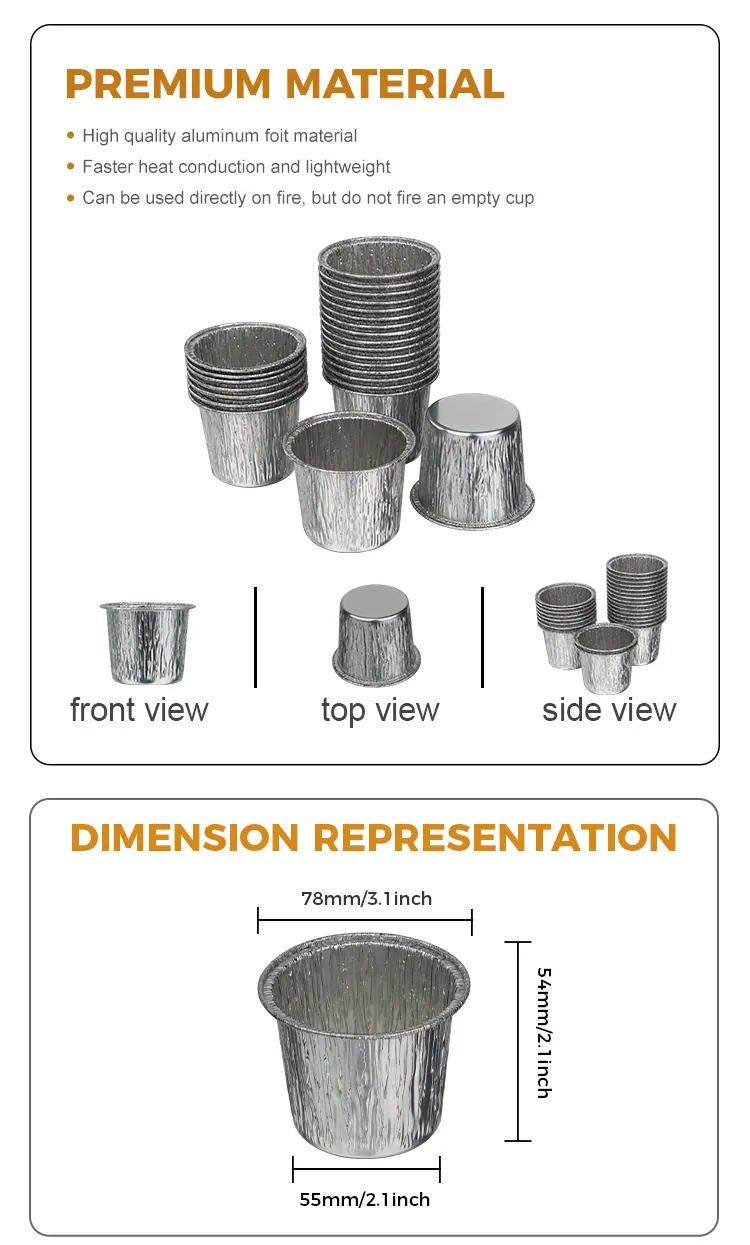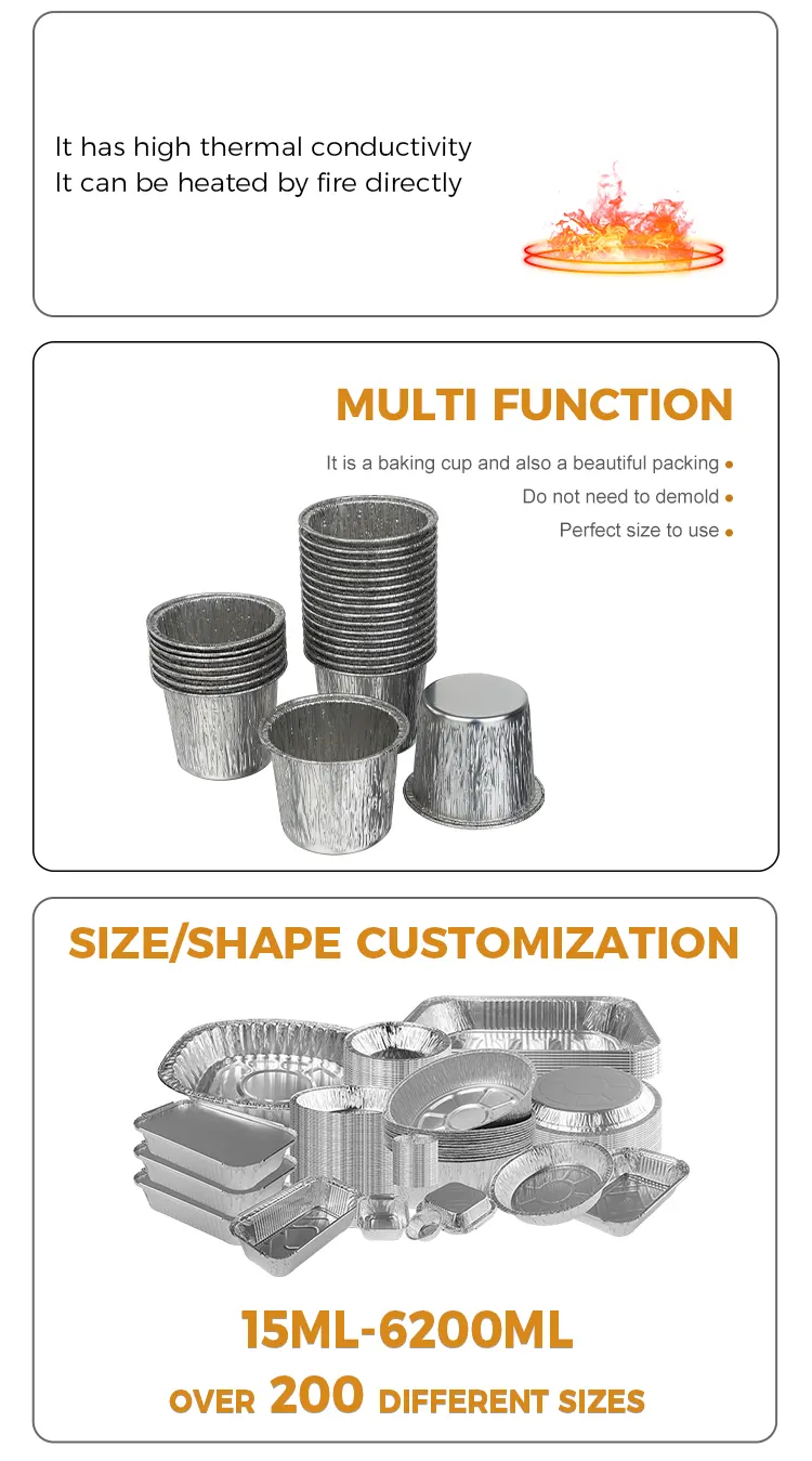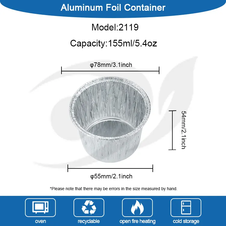 Yunchu Aluminum Foil Manufacturer's disposable round cake cup silver aluminum foil container ay gawa sa food-grade high-purity aluminum foil. Ito ay sumailalim sa mahigpit na pagsusuri sa kalidad at walang amoy at walang nakakapinsalang additives. Ang direktang pakikipag-ugnay sa mga sangkap ay nagbibigay ng higit na kapayapaan ng isip, na nagpoprotekta sa bawat kagat ng tamis at kalusugan. Ang makapal na proseso ng aluminum foil ay lumilikha ng matigas na katawan ng tasa na hindi madaling ma-deform o masira. Maaari itong magamit para sa iba't ibang mga batter ng cake, mousse, puding at iba pang sangkap. Maaari itong makatiis sa mataas na temperatura hanggang 250°C at mababang temperatura na lumalaban hanggang -20°C para sa mga hurno, refrigerator, air fryer at iba pang appliances. Maaari itong mahusay na iangkop sa pagluluto sa hurno, pagpapalamig, at pagyeyelo. Hindi na kailangang palitan ang aluminum foil box at walang masyadong nakakapagod na hakbang. Ang klasikong bilog na disenyo, ang katawan ng tasa ay bilog at makinis, at ang katugmang silver metallic luster ay hindi nangangailangan ng karagdagang palamuti. Maaari itong ihain nang direkta pagkatapos ng pagluluto at magkakaroon ito ng epekto sa presentasyon sa antas ng dessert shop. Ang bibig ng tasa ay pinong kulot, ginagawa itong makinis sa pagpindot at hindi nagkakamot ng iyong mga kamay. Pinipigilan nito ang pagtagas ng batter kapag ibinuhos, at ginagawang mas madali ang demoulding.