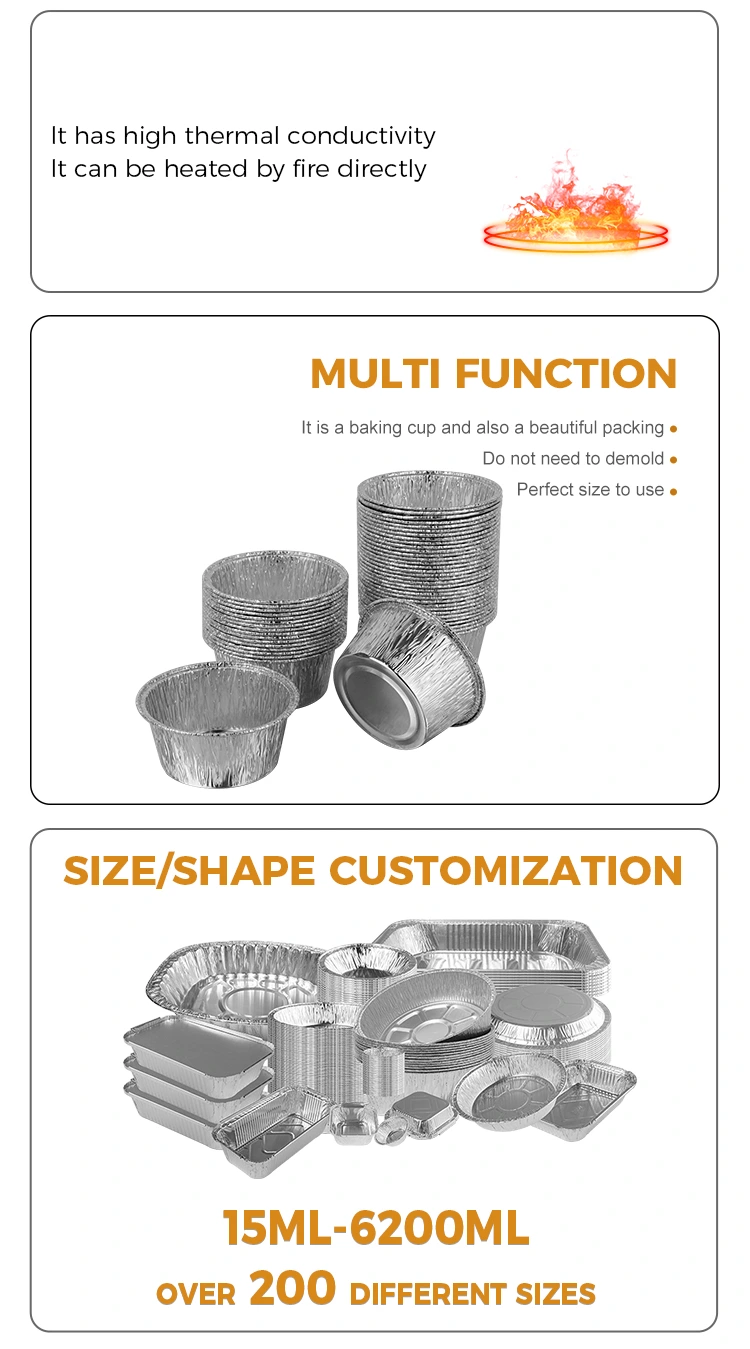 Mga Tampok: Malusog at friendly na kapaligiran, walang kinakailangang paglilinis, angkop para sa paggawa ng iba't ibang mga sambahayan at inihurnong mga pagkain. Ito ang pinakamahusay na pagpipilian para sa mga pamilya at bakery. Ang materyal na aluminyo foil ay ligtas at kalinisan, walang kinakailangang paglilinis, at maaari itong lutong sa isang bukas na siga, ginagawa itong maginhawa para sa paggawa ng masarap na pagkain.
