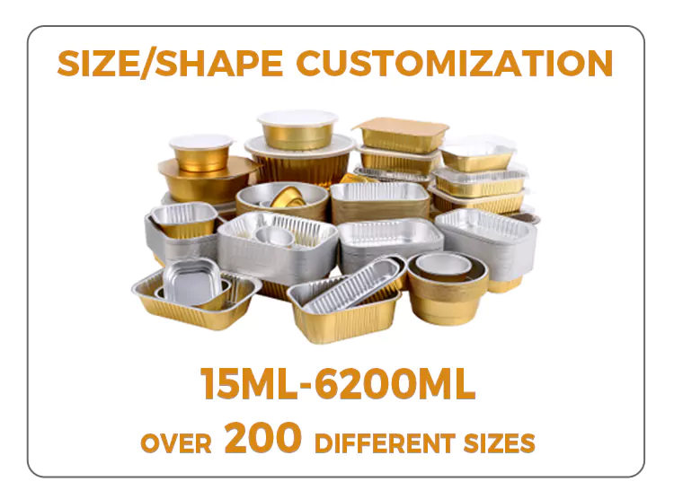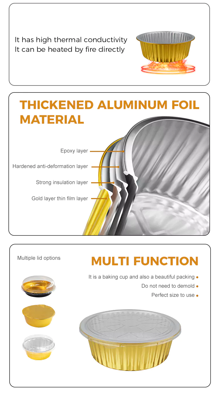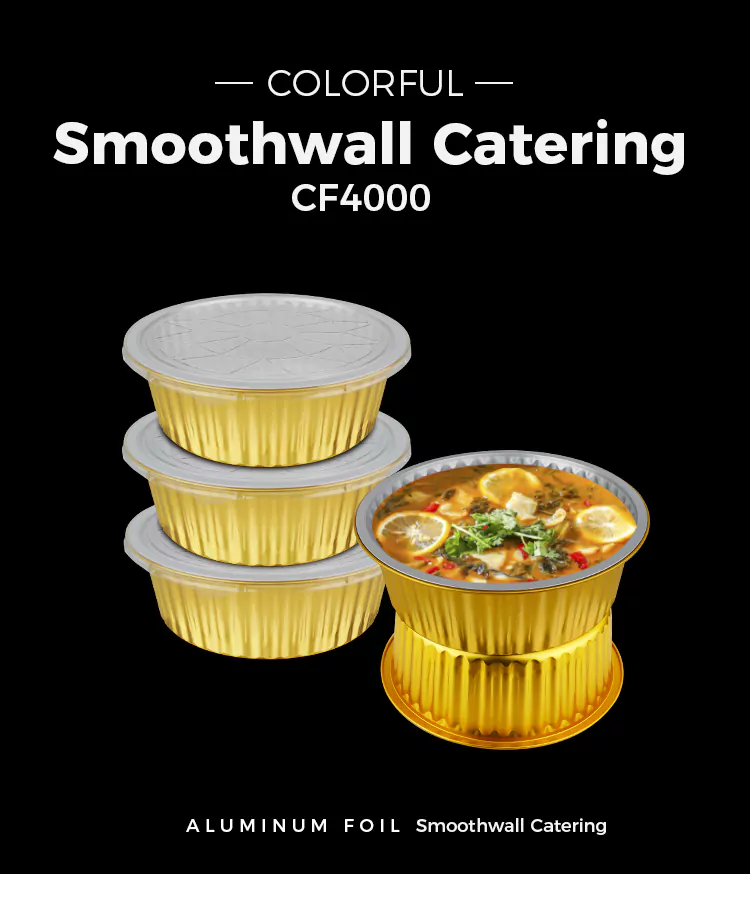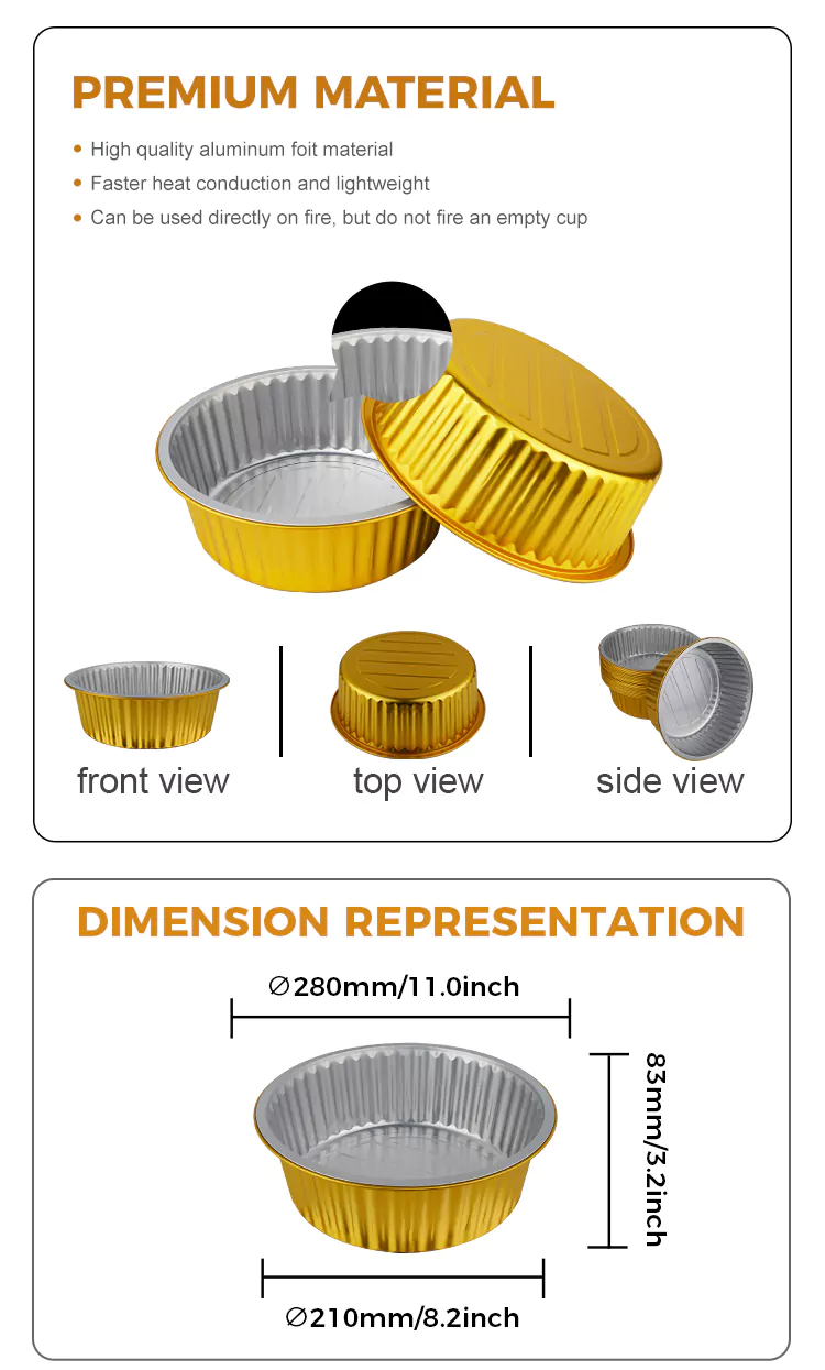 Nakatuon kami sa disenyo ng lakas ng disposable round malaking kapasidad na ginto na mga lalagyan ng foil na aluminyo. Ang kapal ng pader ay proporsyon sa siyentipiko upang matiyak ang parehong kakayahang umangkop para sa madaling paghuhubog at sapat na kapasidad na nagdadala ng pag-load. Hindi ito madaling kapitan ng pagpapapangit o pagtagas kapag ginamit upang hawakan ang mga sopas, pinggan, inihurnong kalakal, atbp. Nag -aalok kami ng iba't ibang mga pagtutukoy ng kapasidad para sa iyong pagpili, mula sa mga mini dessert box hanggang sa mga pack ng pagbabahagi ng pamilya, na nakatutustos sa mga pangangailangan ng iba't ibang mga sitwasyon. Kung ito ay para sa pag -takeout sa mga restawran, tapos na packaging ng produkto sa mga bakery, o pag -iimbak ng mga homemade delicacy sa bahay, lahat sila ay madaling maiakma.