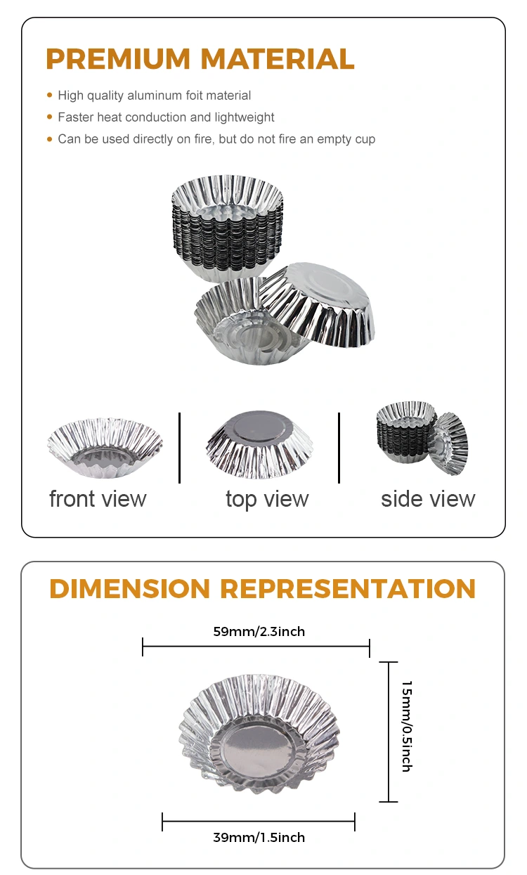Yunchu aluminyo egg tart toast baking pilak aluminyo foil foil container product na pakyawan na dinisenyo para sa mga egg tarts at iba pang mga dessert. Ito ay gawa sa foil na grade aluminyo, na ligtas at hindi nakakalason, at may mahusay na thermal conductivity, tinitiyak na ang pagkain ay pinainit nang pantay-pantay at may mas mahusay na lasa sa panahon ng proseso ng pagluluto. This egg tart tray is versatile and suitable for various occasions such as family gatherings, business events, etc. Easy to remove the mold at high temperature when using, after the finished product is completed, easy to remove the film, non-stick bottom, do not damage the shape, thicken and harden the material that is not easy to deform, good pressure resistance, say goodbye to the trouble of washing the pot and easily protect the pot, isolate oil stains without cleaning after use, smooth bottom is not easy to Ang scorch at stick sa ilalim, ang hindi stick na pagkain ay madaling lutuin, ang ilalim ay makinis, maaaring makatiis -20 ° C ~ 300 ° C, ay maaaring pinainit sa isang bukas na siga, at ang amag ay pinainit nang pantay -pantay.