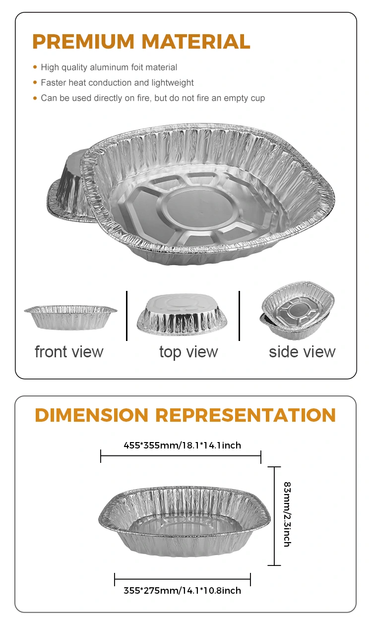Ang Yunchu aluminyo foil supplier's malaking kapasidad na inihaw na manok ng grid na pilak na aluminyo na lalagyan ng foil ay madaling mailagay sa mga kagamitan tulad ng mga malalaking oven, steamers, o freezer. Ang bigat ng produkto ay katamtaman, maaari itong magdala ng bigat ng iba't ibang mga item, at ang hugis at istraktura ay madaling i -stack nang maayos, epektibong nagse -save ng puwang ng transportasyon. Ang produkto ay gawa sa teknolohiya ng light wall, na may isang makinis at malinis na ibabaw, na kung saan ay maginhawa para sa mga malalaking supermarket upang mag -label at mag -scan ng mga code.