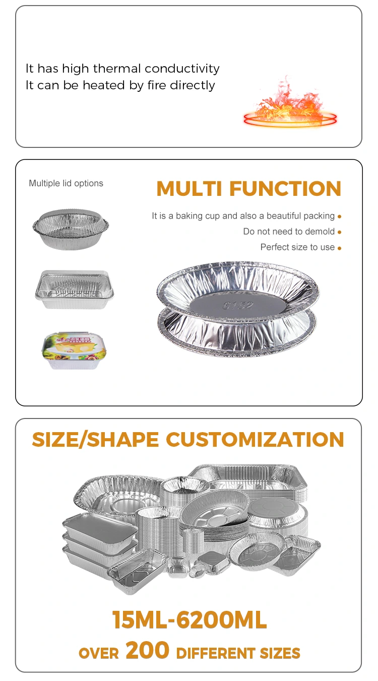 Mga Tampok: Ang isang piraso ng paghubog ng makapal at lutong-lumalaban, pag-ampon ng contact contact grade aluminyo foil material, panigurado na makipag-ugnay sa pagkain, hindi madaling i-deform at hindi tumagas, malakas na kapal, paglaban ng kaagnasan, paglaban ng mataas na temperatura.