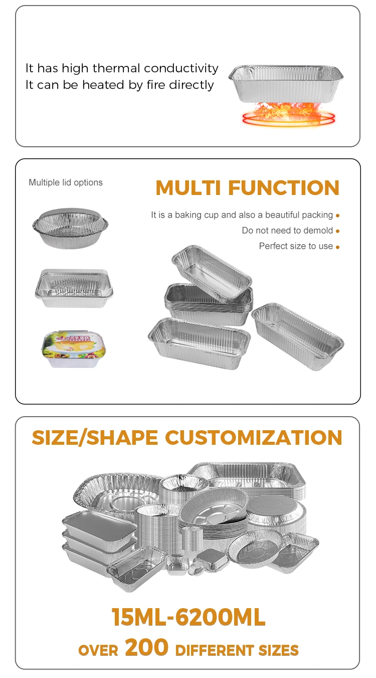 Yunchu Aluminum Foil Supplier Model 2325 Rectangular Air Fryer Takeaway Silver Aluminum Foil Containers Mataas na kalidad na aluminyo na foil na materyal ay pinalapot at hindi madaling masira, at maaaring mapainit sa isang bukas na apoy, ang lalagyan ng aluminyo na ito ay hindi lamang maganda sa hitsura, ngunit napaka-praktikal. Maaari itong makatiis ng high-temperatura na baking, hindi madaling sunugin o ma-deform ang ilalim, at ang disenyo ng ilalim ay maganda rin at matikas, na maaaring epektibong maiwasan ang pagkain mula sa pagdikit. Bilang karagdagan, ang disenyo ng mataas na panig nito ay ginagawang mas matatag at mas madaling gamitin ang aluminyo foil na kumbinasyon. Hindi mahalaga kung aling laki ng pagtutukoy ang iyong pinili, ang lalagyan ng aluminyo na foil na ito ay perpektong umaangkop sa iba't ibang laki ng palayok, na nakatutustos sa iyong magkakaibang mga pangangailangan. Upang payagan ang mas maraming mga mamimili na tamasahin ang mga de-kalidad na produkto at serbisyo, nagbibigay kami ng iba't ibang mga pagtutukoy ng laki na pipiliin, at maaaring ipasadya ang pag-print ng pattern ayon sa iyong mga pangangailangan upang matugunan ang mga isinapersonal na pangangailangan. Sa pamamagitan ng isang solong MOQ na lamang ng 1000 piraso, ang proseso ng pagbili ay simple at mabilis, at ang pagganap ng gastos ay napakataas. Kung mayroon kang anumang mga katanungan o nangangailangan ng karagdagang pag -unawa tungkol sa aming mga produkto, mangyaring huwag mag -atubiling makipag -ugnay sa amin, matutuwa kaming maglingkod sa iyo.
