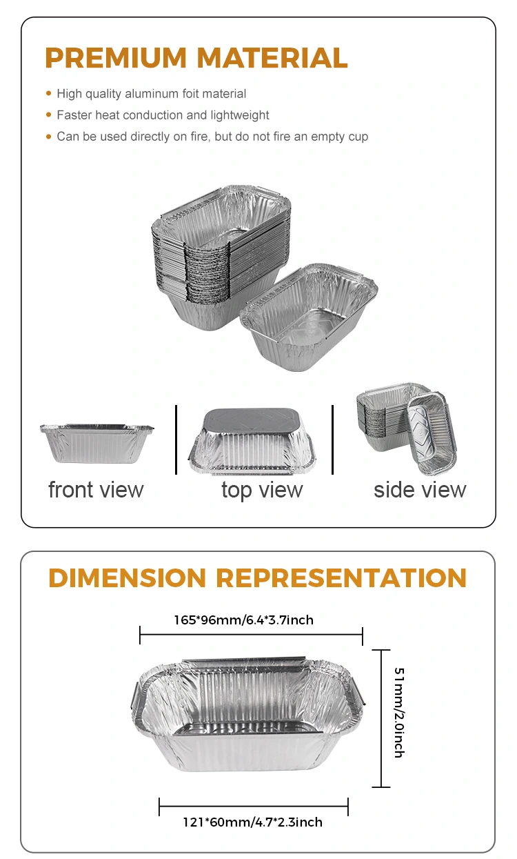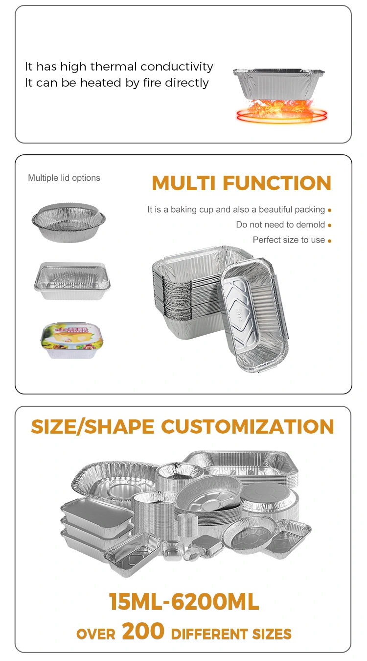 Mga Tampok: Ang kahon ng tanghalian ng foil ng aluminyo na ibinibigay namin ay gawa sa 8011 aluminyo foil material, na may mahusay na pagganap ng pangangalaga ng init at maaaring epektibong mapanatili ang temperatura ng pagkain, na ginagawang mas kaakit -akit ang iyong pagkain. Sa partikular, ang aming hugis -parihaba na inihurnong bigas na pilak na aluminyo na mga lalagyan ng foil ay hindi lamang may mga katangian ng pagkakabukod ng thermal, ngunit maaari ring pagsamahin sa mga aluminyo foil lids o mga plastik na plastik na lids upang mapadali ang isinapersonal na pagpapasadya ng mga logo, sa gayon ay pinapahusay ang mga puntos ng memorya ng customer at pagpapahusay ng kamalayan ng tatak.