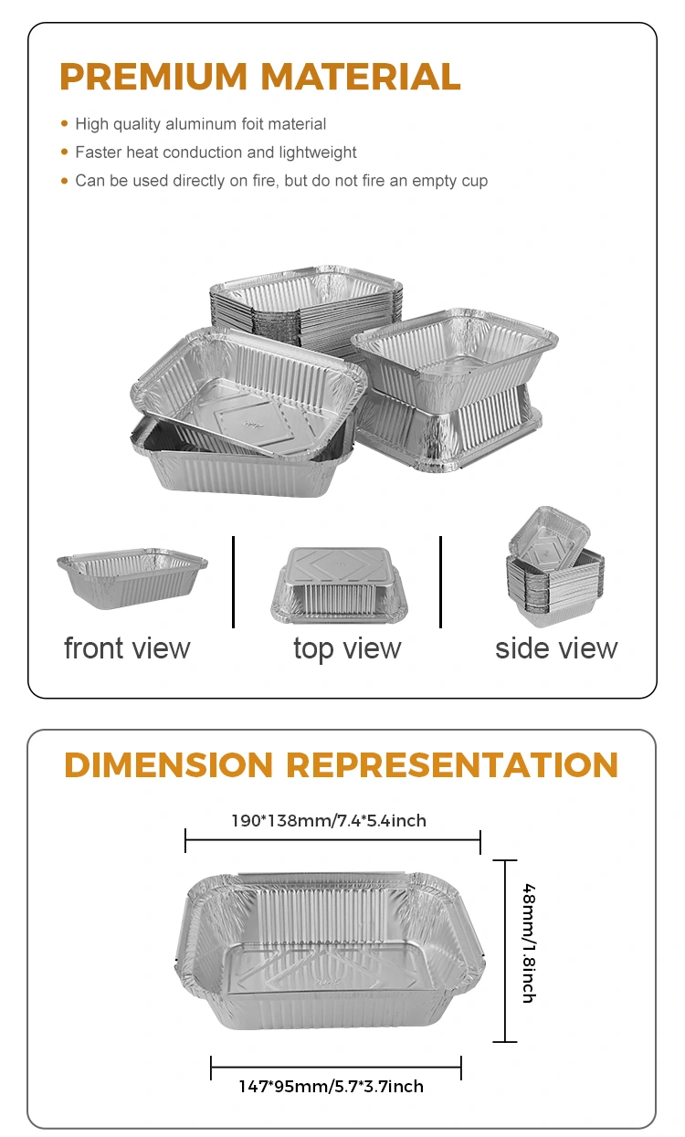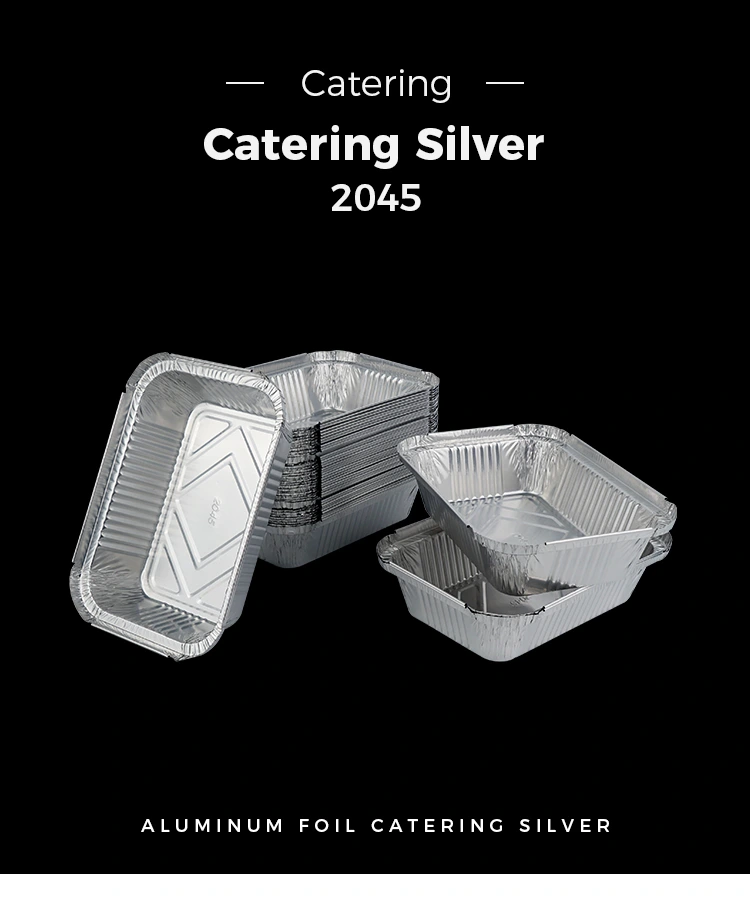 Ang mga kahon ng tanghalian ng foil ng aluminyo na ibinibigay namin ay gawa sa 8011 na materyal na foil na aluminyo, na may mahusay na mga katangian ng pagkakabukod ng thermal at maaaring epektibong mapanatili ang temperatura ng pagkain. Sa partikular, ang aming hugis -parihaba na pilak na aluminyo na lalagyan ng foil para sa mga kahon ng tanghalian ng tanghalian ay hindi lamang may mga katangian ng pangangalaga ng init, ngunit maaari ring magamit gamit ang isang takip ng aluminyo na foil upang mapadali ang isinapersonal na pagpapasadya ng logo.