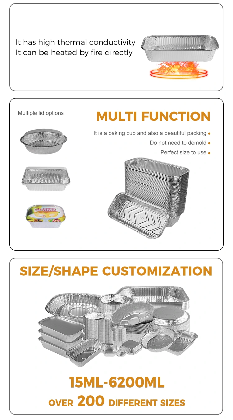 Mga Tampok: Ang kahon ng tanghalian na pakyawan 8011 aluminyo foil material ay gawa sa mahusay na pagpapanatili ng init, na maaaring mapanatili ang temperatura ng pagkain at gawing mas masarap ang pagkain. Bilang karagdagan, ang aming hugis -parihaba na barbecue na pilak na aluminyo foil container ay mayroon ding function ng pangangalaga ng init, na maaaring maitugma sa aluminyo foil paper takip at alagang plastik na takip, na maginhawa para sa iyo upang ipasadya ang iyong logo, karagdagang pagpapalalim ng impression ng customer, at mapahusay ang imahe ng iyong tatak.
