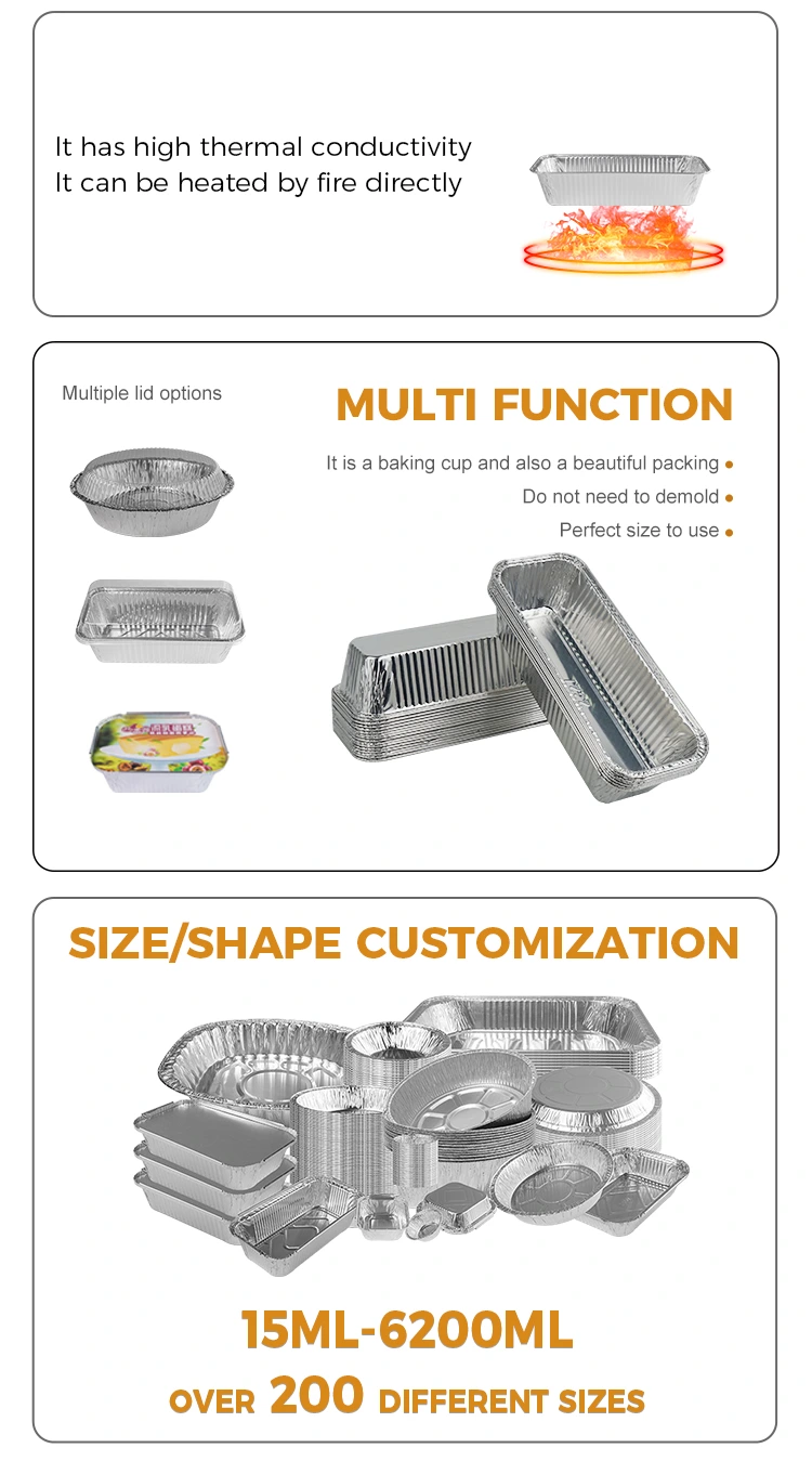 Ang hugis -parihaba na tinapay ng aluminyo ng aluminyo ng aluminyo na foil ay sumusuporta sa iba't ibang mga pamamaraan ng pag -init, kaya masisiyahan ka sa kasiyahan ng pagluluto sa anumang oras, at ang epekto ng pangangalaga ng init ay kapansin -pansin. Ang na-upgrade at makapal na disenyo, napiling de-kalidad na mga materyales na palakaibigan, foil na grade aluminyo, isang istraktura ng paghubog ng isang piraso ay mas maaasahan. Ang disenyo ng crimped edge ay nagsasagawa ng init nang mabilis at pantay, na ginagawang mas malamang na sunugin ang ilalim sa panahon ng pagluluto at gawing mas madali para sa pagkain na mag -demold. Ang produktong ito ay malawakang ginagamit sa larangan ng barbecue at pagluluto, lalo na ang angkop para sa iba't ibang mga okasyon tulad ng kamping, bakery, barbecue stall, paghahatid ng takeaway, at mga sushi na restawran. Ang disenyo nito ay mahusay na inangkop sa mga praktikal na pangangailangan ng karamihan sa mga tahanan at tindahan.