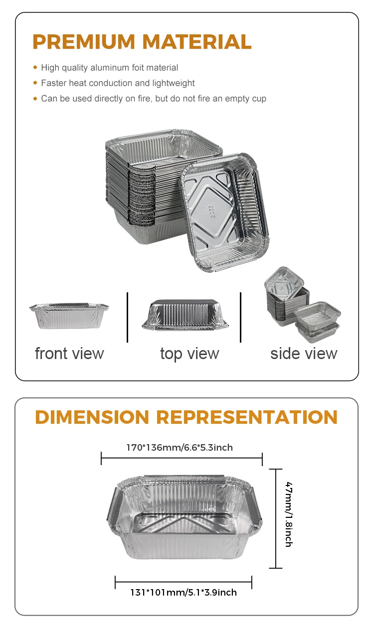Ang Made in China Model 2056 Rectangular gratin ay nakabalot na pilak na mga lalagyan ng foil na aluminyo ay isang napaka -katamtaman na sukat, na may isang tuktok na diameter ng 170*136 mm (6.9*5.3 pulgada), isang base diameter na 131*101 mm (5.1*3.9 pulgada), isang taas na 47 mm (1.8 pulgada), at isang kapasidad na 620 mL (21.8 oz). Ang laki na ito ay hindi lamang madaling dalhin, ngunit nakakatugon din sa iba't ibang iba't ibang mga pangangailangan sa paggamit.