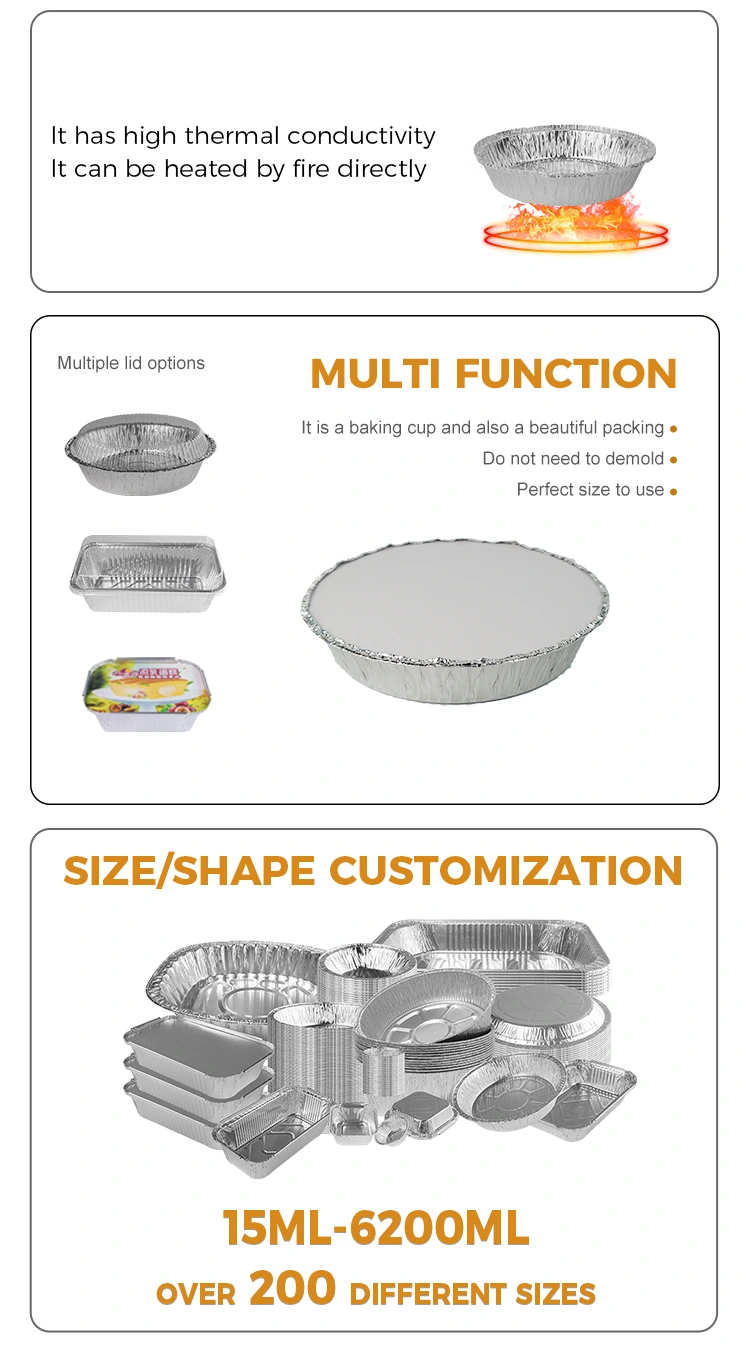 Mga Tampok: Ang isang piraso ng paghubog ng makapal at lutong-lumalaban, pag-ampon ng contact contact grade aluminyo foil material, panigurado na makipag-ugnay sa pagkain, hindi madaling i-deform at hindi tumagas, malakas na kapal, paglaban ng kaagnasan, paglaban ng mataas na temperatura.