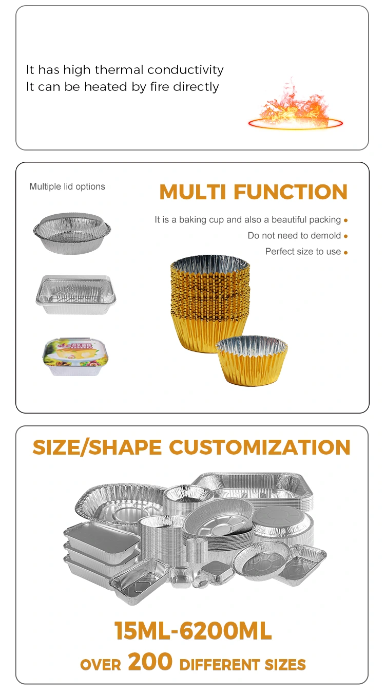 Ang pag -ikot ng maliit na pakete ng baking pilak na aluminyo na lalagyan ng foil ay angkop para sa pag -iimpake ng lahat ng mga uri ng maliliit na produkto ng panaderya, mahigpit naming kinokontrol ang bawat hakbang sa paggawa sa mga tuntunin ng kontrol ng kalidad upang matiyak na ang lahat ng mga produkto ay nakakatugon sa mga pamantayan sa kaligtasan ng pambansang, at naipasa ang sertipikasyon ng ERP ng Aleman, sertipikasyon ng EU SGS at sertipikasyon ng ISO9001.