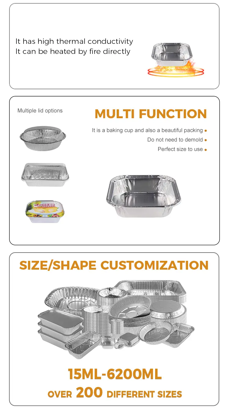 Yunchu aluminyo foil supplier square cake air fryer pilak aluminyo foil containererscan din ay malawakang ginagamit sa iba't ibang mga eksena, tulad ng: oven baking, air fryer, bukas na siga ng pag-init, ang steamer steamer at iba pang kagamitan ay gumagamit ng unipormeng init na pagpapadaloy, unipormeng pag-init sa parehong oras ay maaari ring maiwasan ang hindi-stick na pan, madaling ilabas ang hulma, atbp. Ang mga lalagyan ng foil ay gagamitin para sa pagluluto ng maliliit na cake, homemade yogurt, jelly puding, inihurnong itlog, pagkaing-dagat at iba pang mga pagkain, ang ilalim ng malukot at disenyo ng convex, maglaro ng isang di-slip na papel, ang ganap na kulot na disenyo ng gilid ay maaaring magamit sa isang alagang hayop na ganap na transparent na takip upang mai-lock ang temperatura at masarap na pagkain.