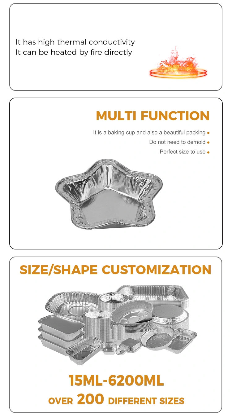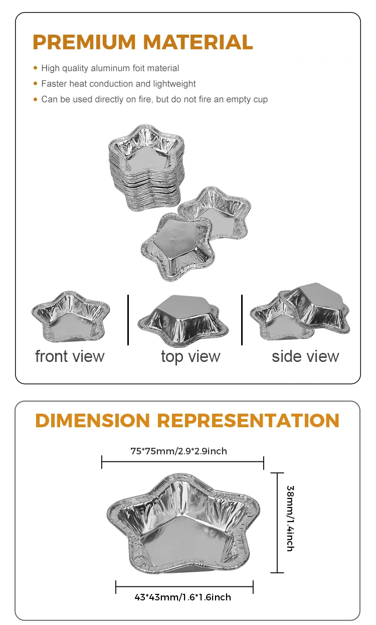 Yunchu aluminyo foil supplier star-shaped aluminyo foil tart tasa para sa baking aluminyo foil food container, makapal na aluminyo foil lata tart amag na may matatag na hugis, na gawa sa materyal na grade na aluminyo na foil, ginagawang mas madali upang mag-demold pagkatapos ng pagluluto. Ang mga hugis-star na aluminyo foil tart tasa para sa pagluluto ng aluminyo na foil na lalagyan ng pagkain ay mataas na temperatura na lumalaban, hindi madaling sunugin o stick, na may dinisenyo at naproseso sa ilalim at mga gilid para sa kahit na pag-init ng init, pampalapot at pinalakas na pinagsamang paghuhulma, na karaniwang ginagamit para sa air frying, steaming, baking, atbp.